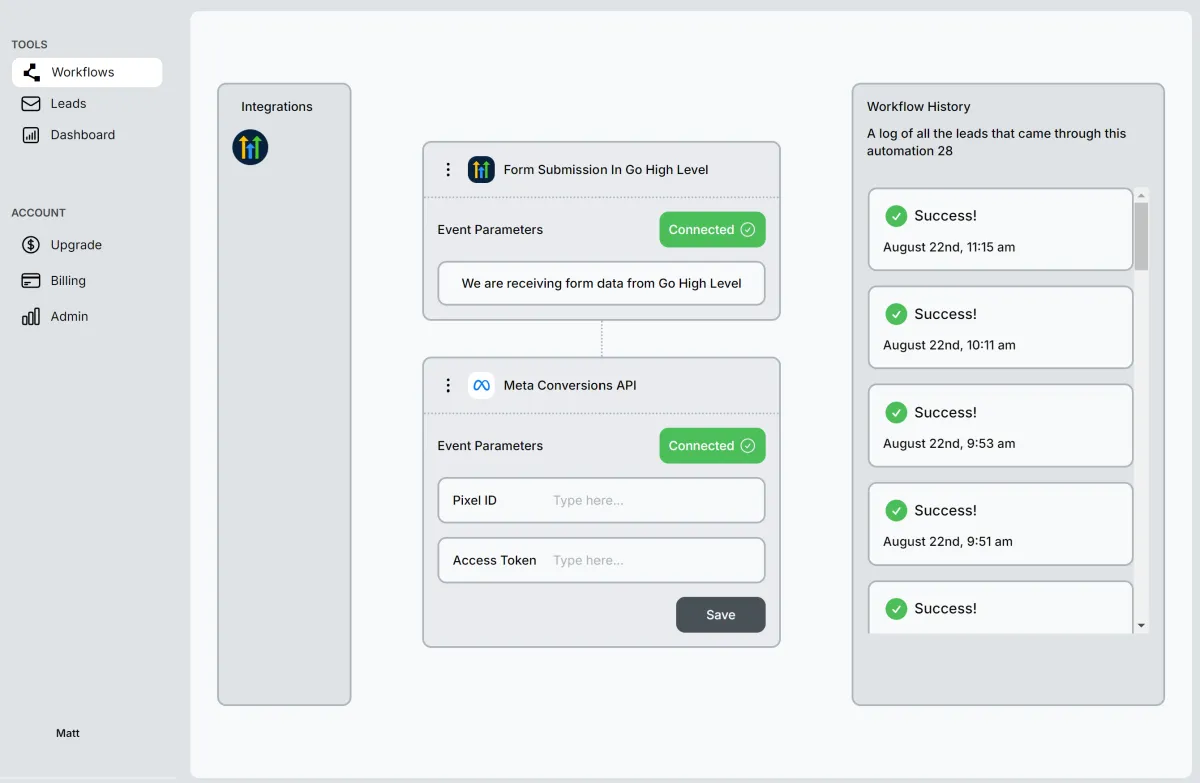 This tool, built with Bubble, automates the process of sending user leads from various sources to Facebook's Conversions API, improving ad attribution and tracking. It also includes a comprehensive analytics dashboard. This project showcases how no-code tools can be used to create powerful integrations between different platforms and services, streamlining complex marketing and analytics processes.